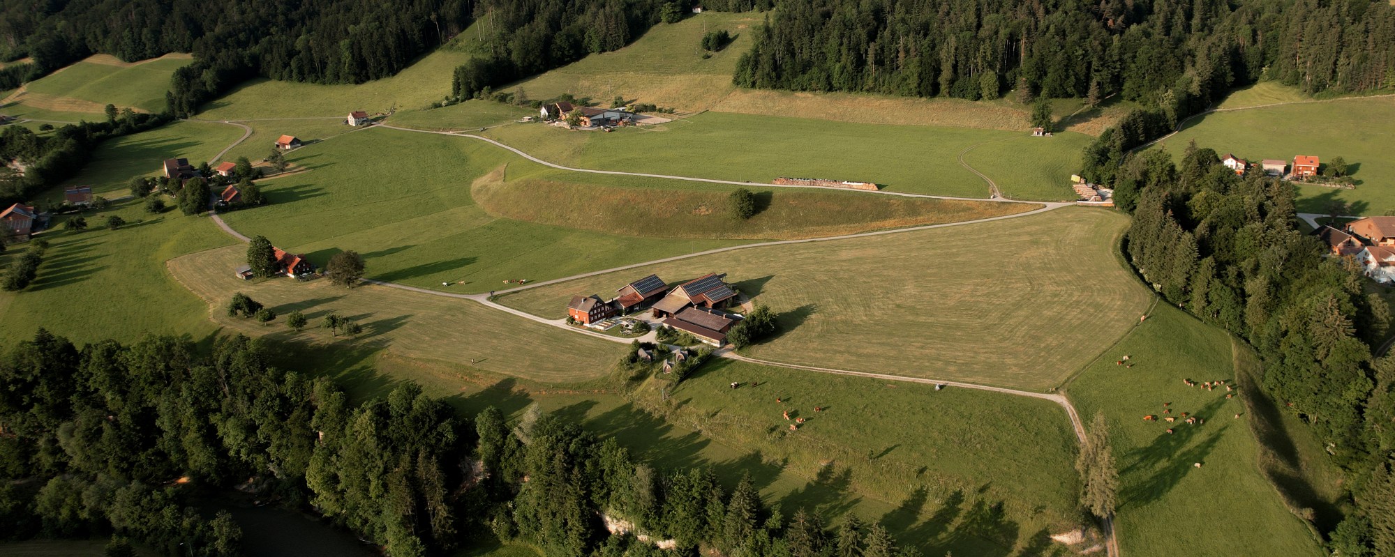 Unser Betrieb umfasst rund 15 Hektaren Wiesen- und Weideland, darunter 1.3 Hektaren extensiv bewirtschaftete Flächen – Lebensraum für zahlreiche Pflanzen und Tiere. Auf etwa einem Hektar bauen wir zudem Bio-Getreode an. Bald dreissig Jahre bewirtschaften wir unseren Hof konsequent nach den Richtlinien von Bio Suisse – aus Überzeugung und mit viel Herzblut.